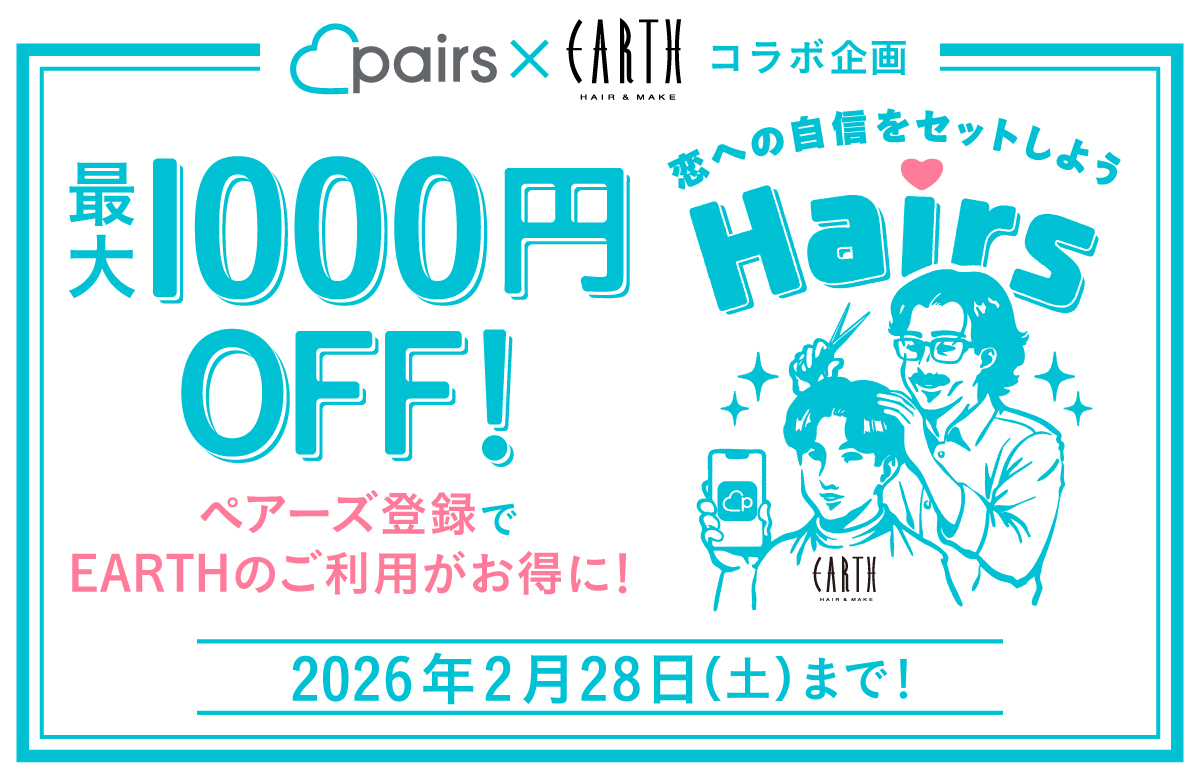 そこで、恋活・婚活マッチングアプリの『Pairs』と、全国展開の美容室EARTHがタッグを組んで、恋をする人を応援します!